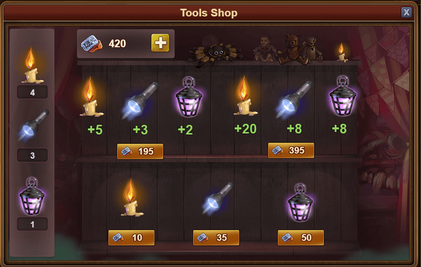 - começa-se com 7 velas, 3 lanternas e 1 candeeiro e podem ser compradas mais em 7;