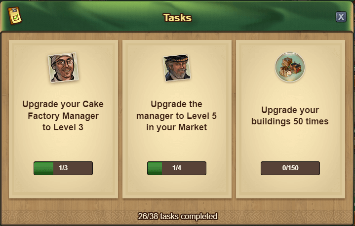 11 | Contratar um gestor da fábrica de bolos | Evoluir o gestor do festival ao nível 3 | Evoluir edifícios 50 vezes |