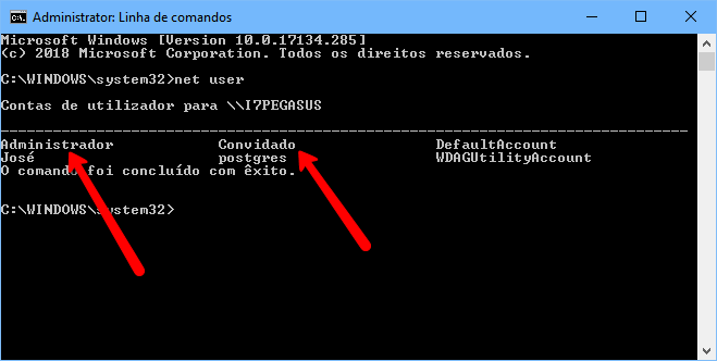 Para sabermos que utilizadores estão presentes no nosso sistema, na janela podemos escrever "net user" seguido de "enter", e iremos ter uma lista dos utilizadores.