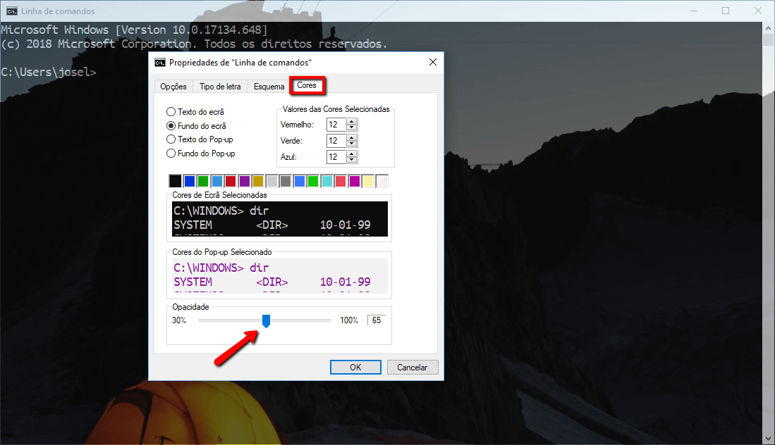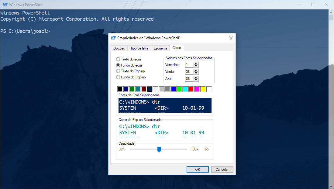 Ajustar a transparência da janela de comandos (aplica-se a janela de comandos normal ou janela de powershell) é uma operação simples que se consegue efectuando os seguintes passos: