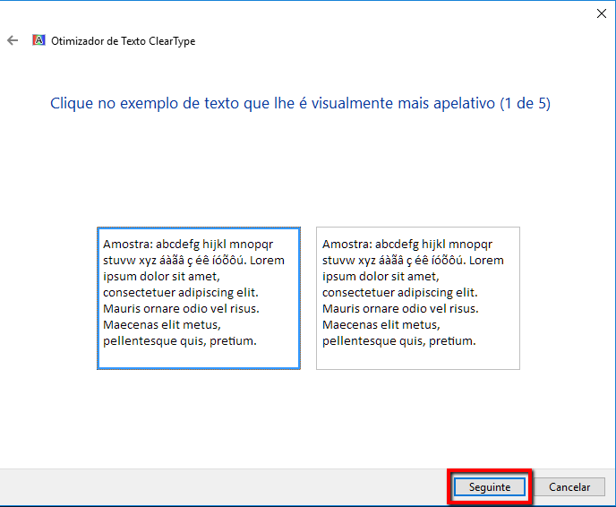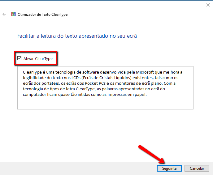 Irá surgir a janela de configuração e nesta janela activar a "checkbox" de "Activar Clear Type" e clicar em seguinte.