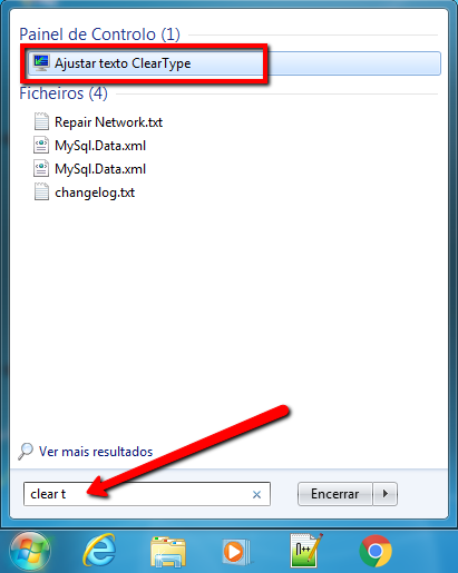 Depois nesta caixa começar a escrever "clear type"... Enquanto fazemos isto, deverá surgir o item "Ajustar Clear Type". Clicar neste item.