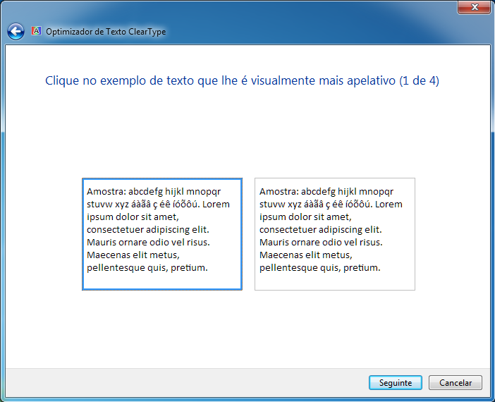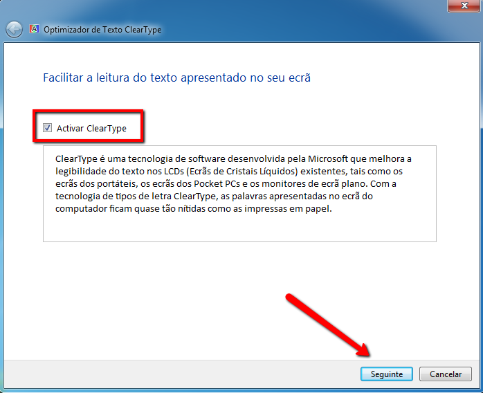 Irá surgir a janela de configuração e nesta janela activar a "checkbox" de "Activar Clear Type" e clicar em seguinte.