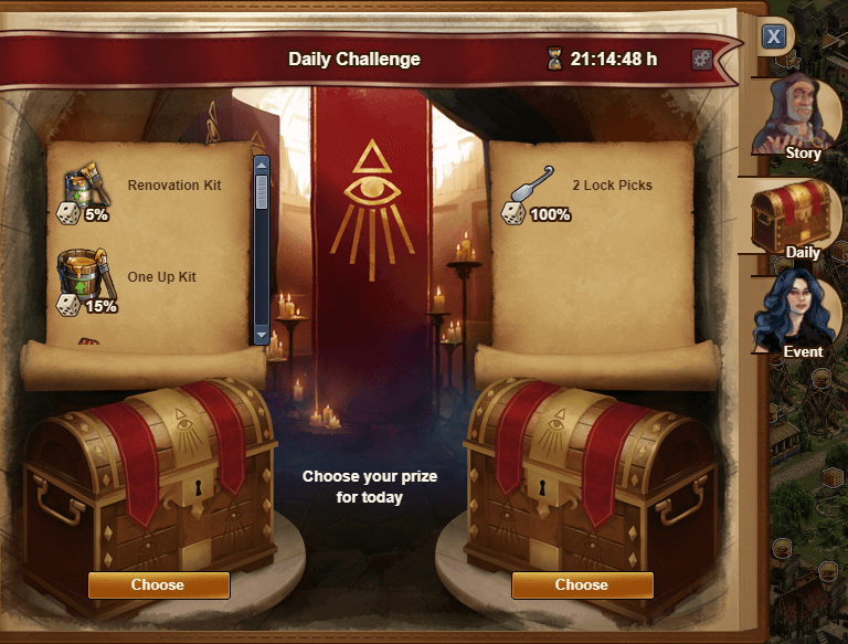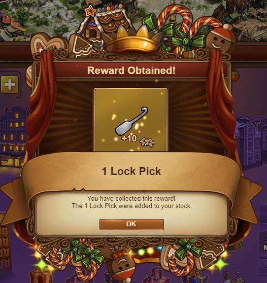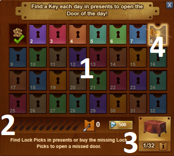 Qual vai ser a mecânica desta janela... Diariamente, ao abrir presentes, temos a possibilidade de ganharmos uma recompensa especial que corresponde á chave que abre o cofre correspondente ao dia em questão (os cofres bloqueados estão escurecidos), onde a título de exemplo corresponde ao 4 da imagem. Se já tivermos conseguido a chave do cofre do dia nessa recompensa especial, se voltarmos a conseguir obter novamente essa recompensa, iremos obter 10 estrelas e uma gazua.