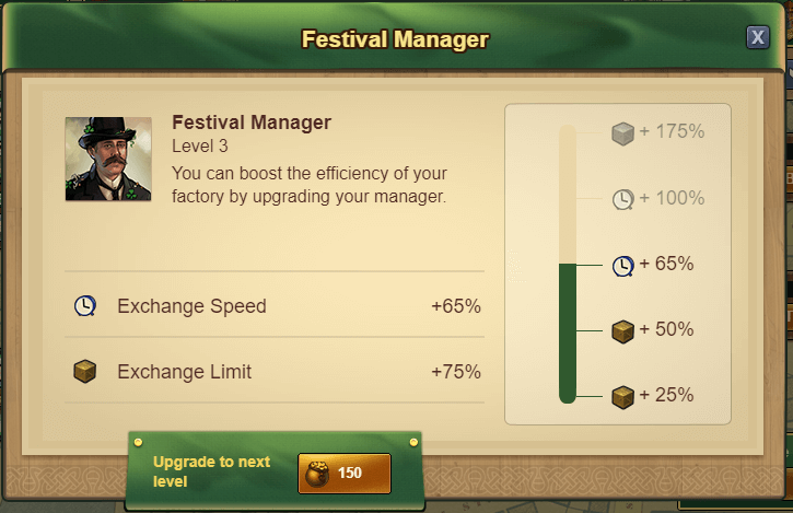De igual forma, podemos contratar gestores para automatizar o processo de transporte, fabricação e consumo de mercadorias. A contratação de gestores têm um custo inicial em potes de ouro e depois cada evolução do mesmo, até a um máximo de 5 (inicial mais quatro) também têm um custo em potes de ouro, que irá sendo superior a cada subida. A evolução dos gestores aumenta a capacidade produtiva, o transporte ou a rapidez de produção. Podemos ver esses dados na tabela abaixo: