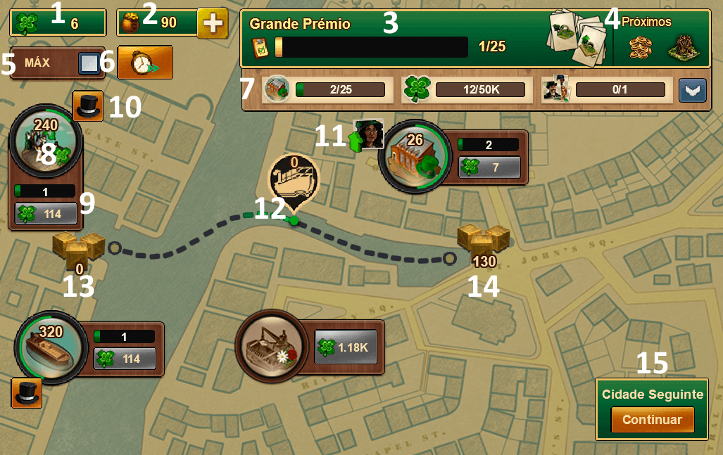 - Botão para avançar para outra cidade. Só conseguimos efectuar o "salto" quando tivermos os 8,4 quatriliões de trevos. Ao saltar de cidade, iremos passar por uma janela intermédia de recompensas antes de iniciar a próxima cidade.