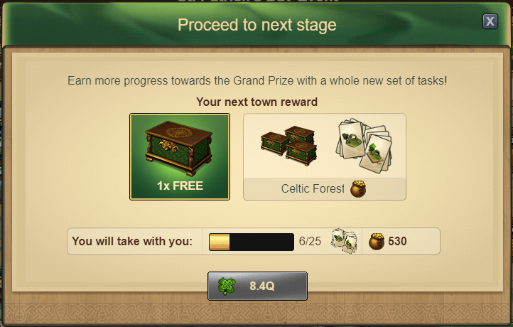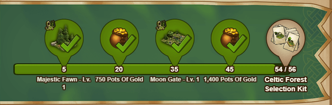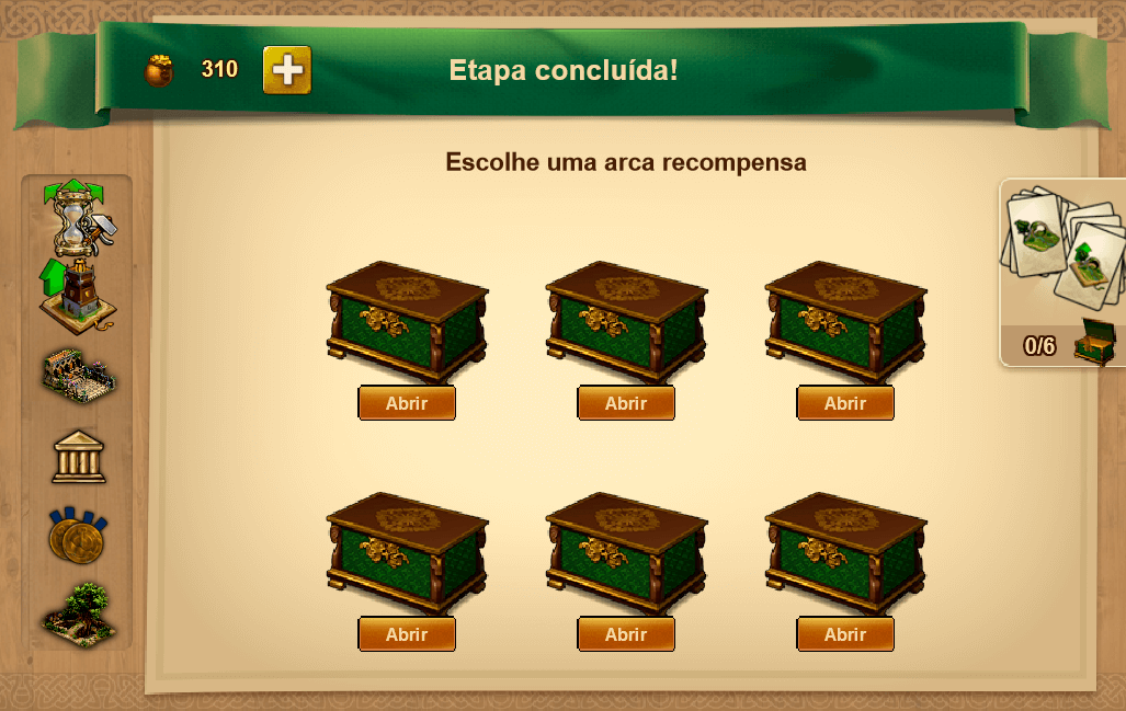 Quando avançarmos para a próxima cidade, somos contemplados com uma janela de recompensas opcionais. Nesta janela vamos ter 6 baús que vamos poder abrir. Um deles é aberto gratuitamente, os outros teremos que pagar um determinado número de potes de ouro para os abrir. As recompensas que cada baú atribui aleatoriamente encontram-se presentes verticalmente à esquerda. Este valor sobe de acordo com os baús que forem abertos. Se abrirmos os 6 baús, ganhamos adicionalmente ás recompensas de cada baú a recompensa indicada à direita e que corresponde a um "Kit selecção Floresta Celta".