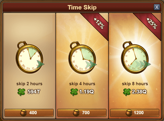 - Possibilidade de fazer avançar o relógio 2, 4 ou 8 horas produzindo de imediato a produção estimada para este tempo de acordo com a capacidade produtiva no momento. Para activar cada salto no tempo é necessário gastar os potes de ouro pedidos.