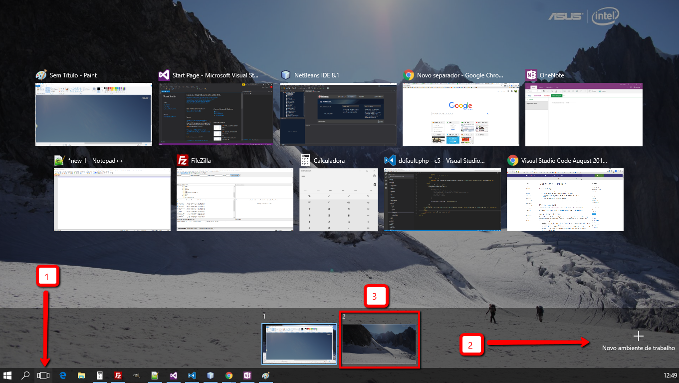 - Com o rato na "Vista de tarefas" (junto ao icone do meu iniciar) e e clicando em "Adicionar uma área de trabalho" (item 1 na imagem seguinte);